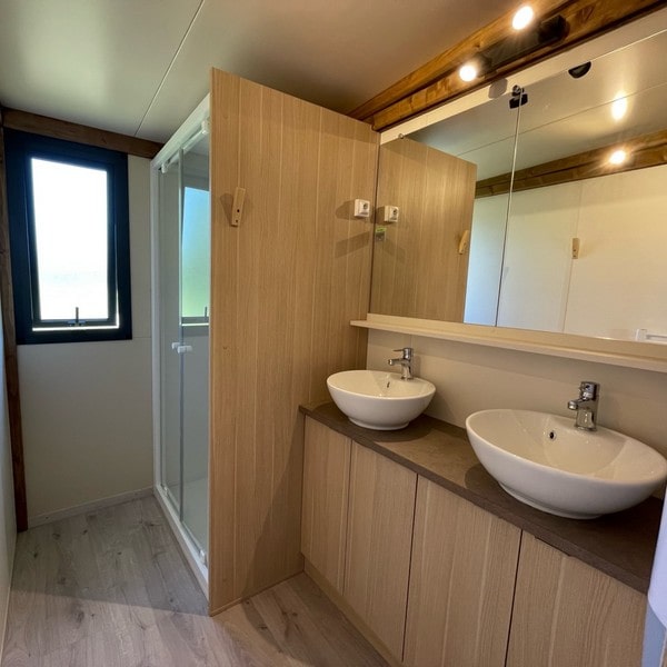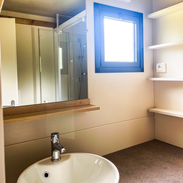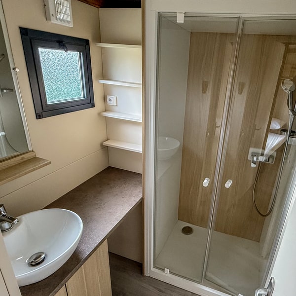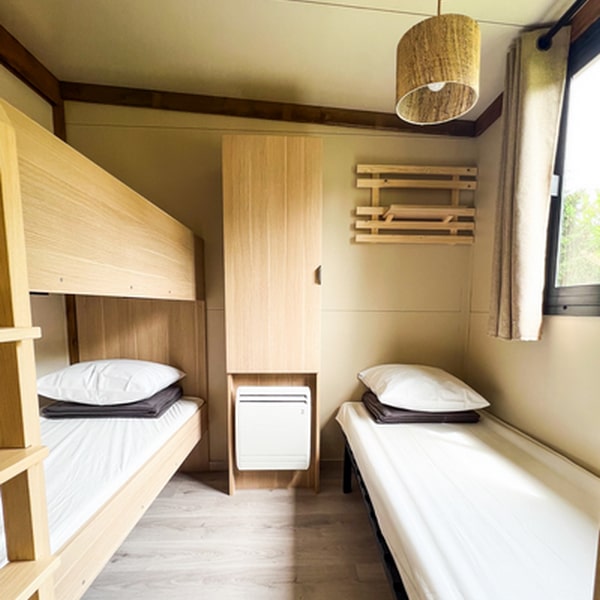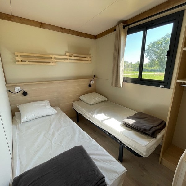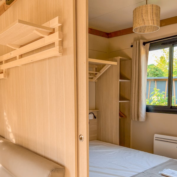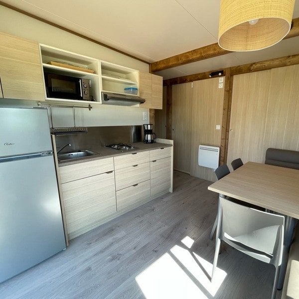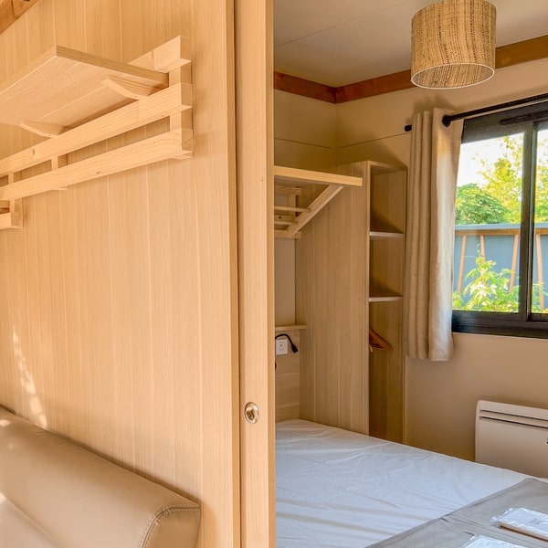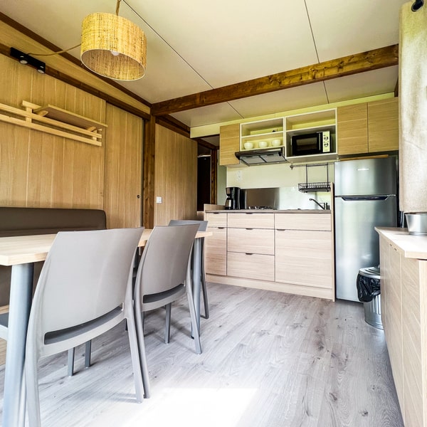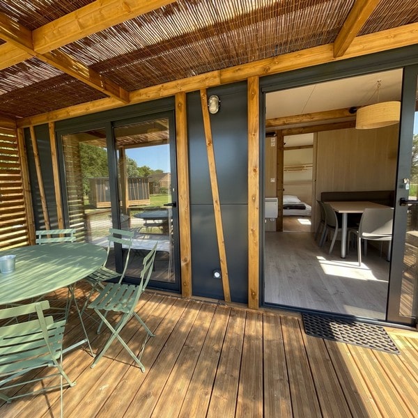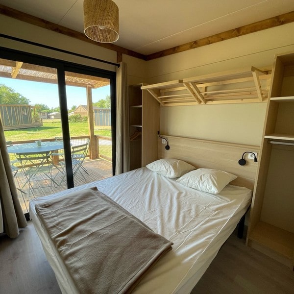 This large chalet for 6 people allows you to enjoy a camping holiday with your whole family! With its large living room featuring a dining area and a fully equipped open-plan kitchen, it will satisfy your desire for space and storage. Not to mention the spacious terrace with pergola, accessible from both the large bay window in the living room and the double bedroom! Ideal for relaxing on a lazy day…