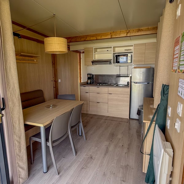 No kitchen in the tent—guests can use the campsite’s shared kitchen and “Accueil Vélo” cyclist facilities.