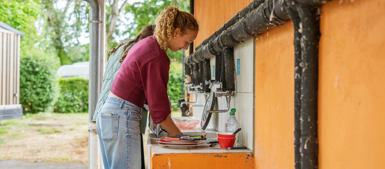 Sanitary block with showers, toilets, washbasins, dishwashing areas, baby changing area, and facilities for people with reduced mobility.